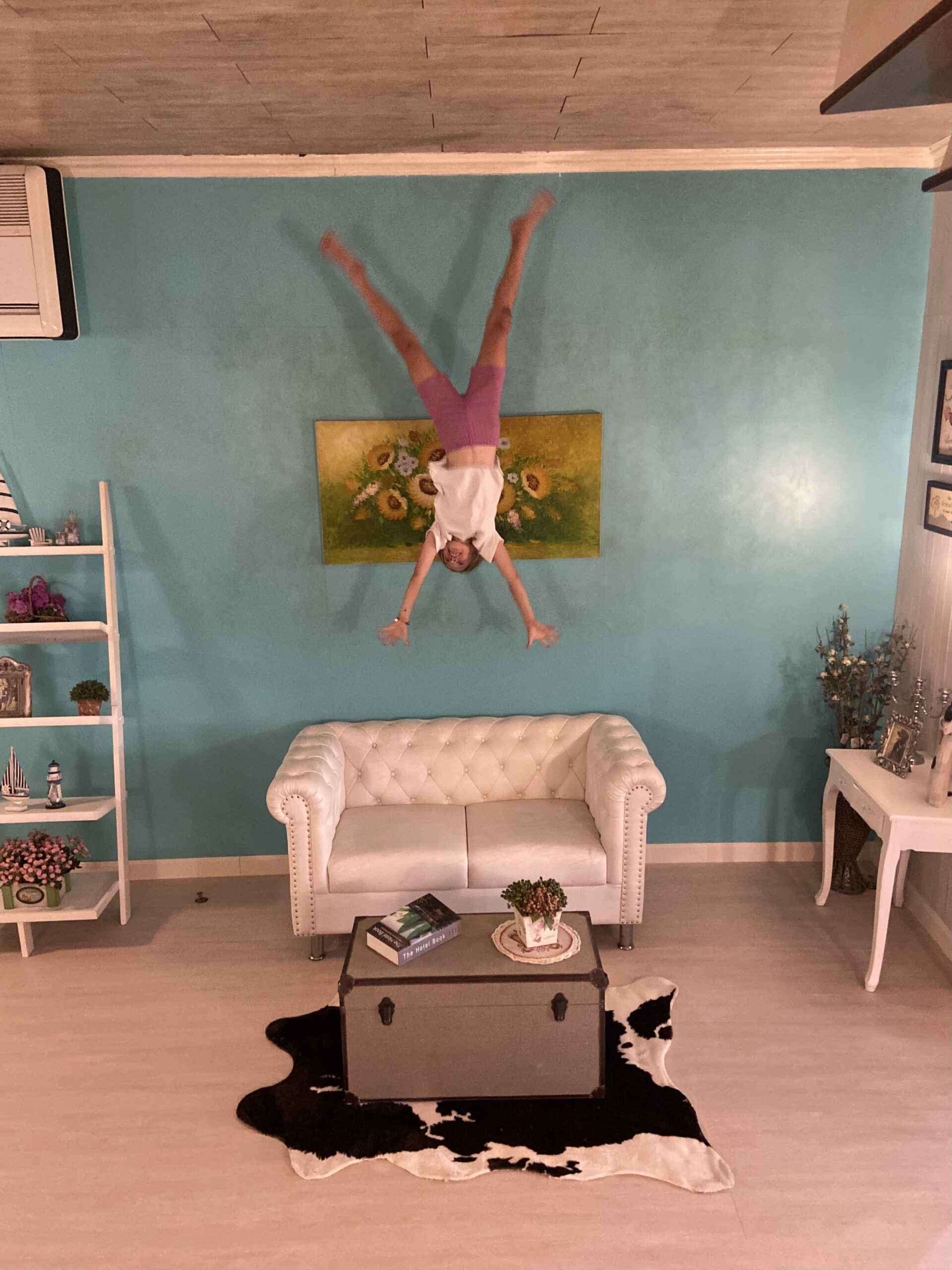 The kids were a little confused at first as they walked into the room to see an entire house, furniture, bedroom, tv and everything turned upside down and glued to the ceiling. Then, a staff member, clearly thrilled with something to do, took my phone and took a photo of us. She instructed us to rotate the photo and lo and behold, there we were, hanging from the roof like bats. Super Cool!